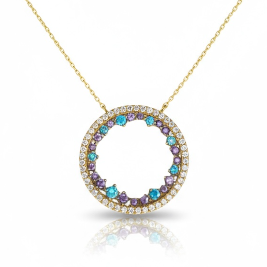 585 (14k) Echtgold Kette mit Kreis Anhänger & Zirkonia in Blau & Violett – 41 cm – „Galaxia Circle“