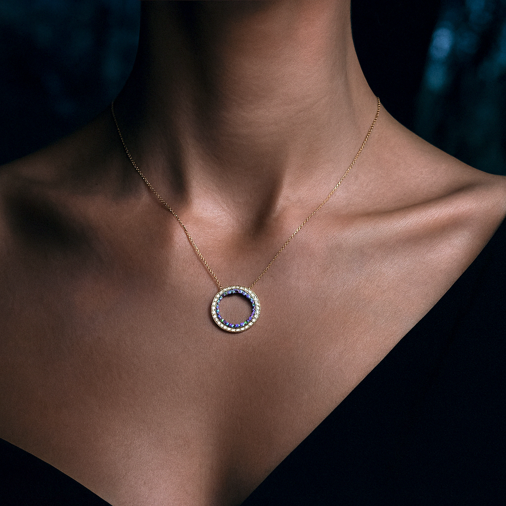 Der elegante Anhänger (Durchmesser: 1,9 cm) ist meisterhaft besetzt mit funkelnden Zirkoniasteinen in intensiven Blau- und Violetttönen. Diese Farbkombination erinnert an eine nächtliche Galaxie und symbolisiert Unendlichkeit, Freiheit und Tiefe.