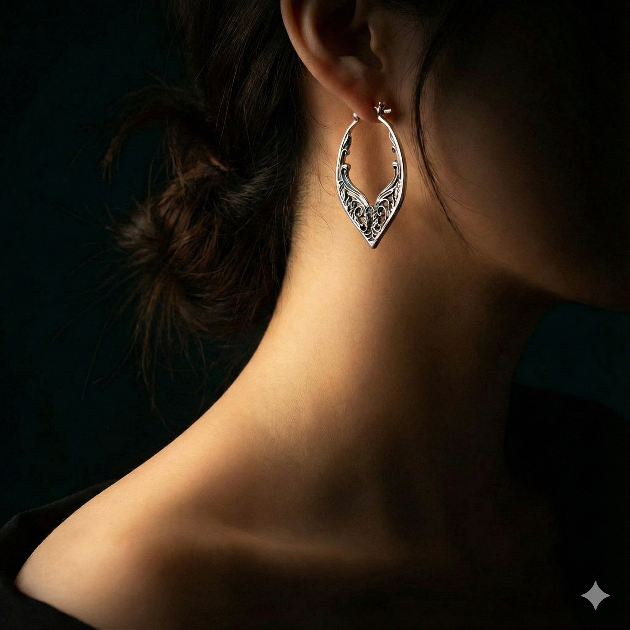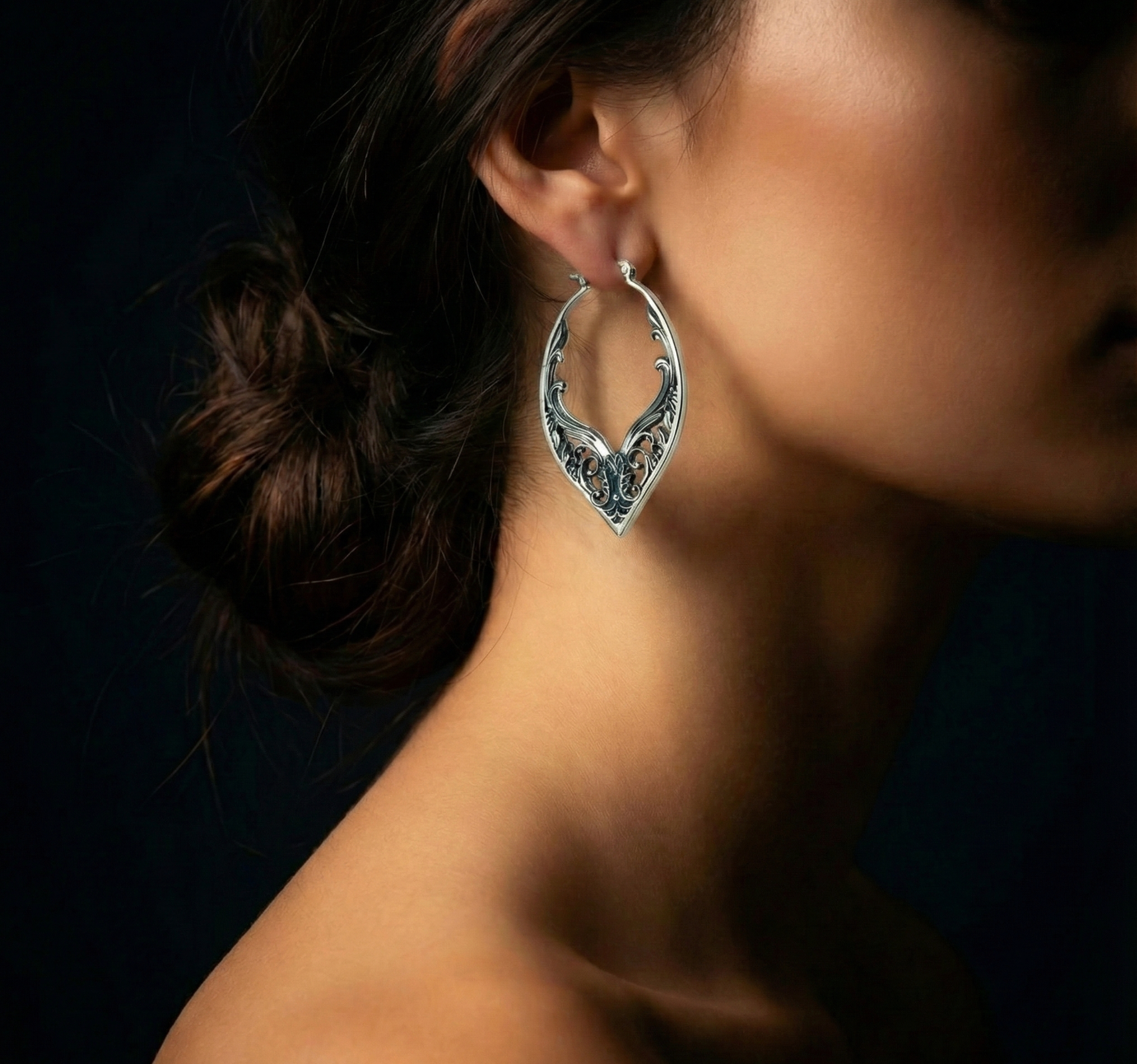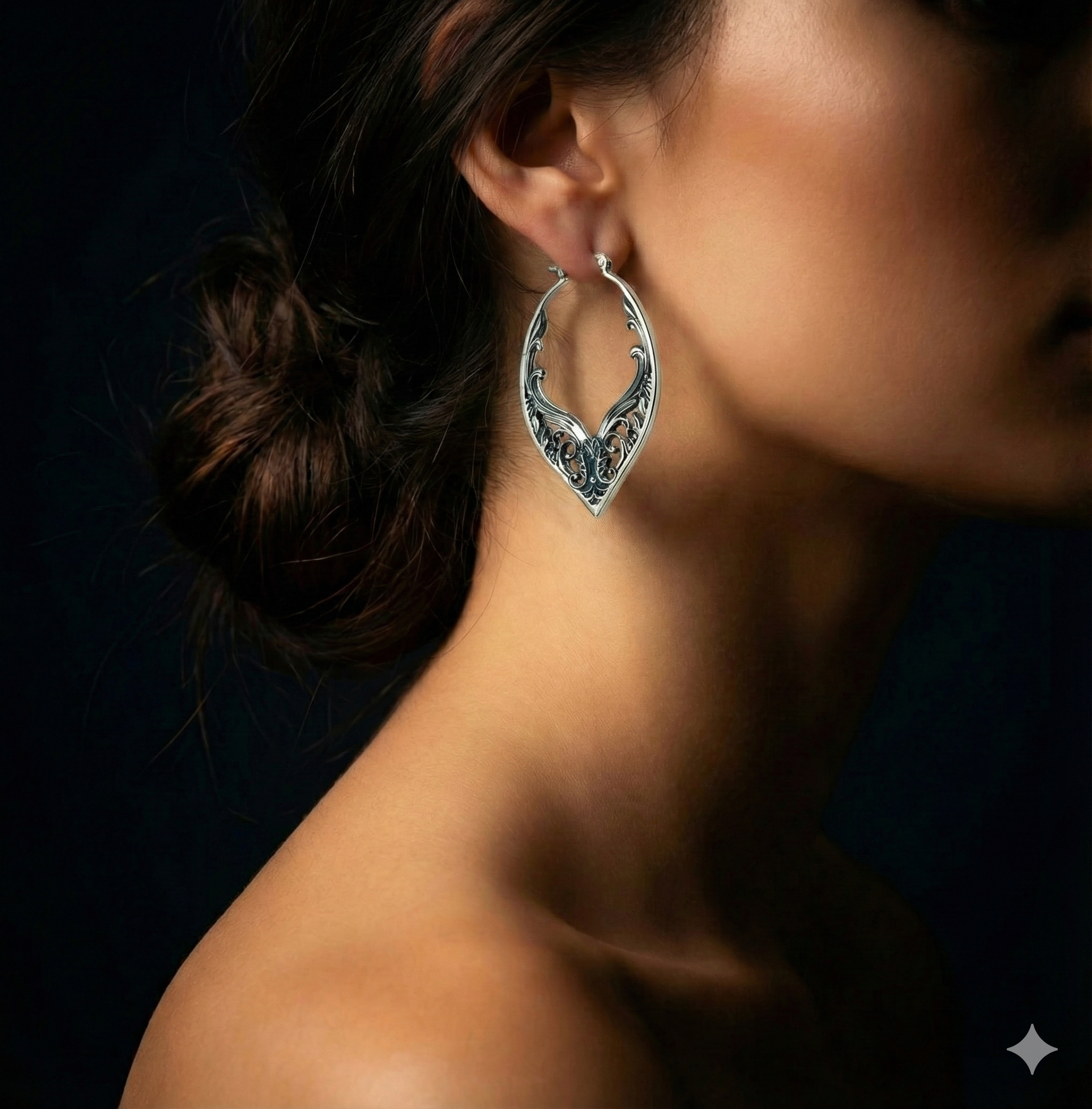 Diese eleganten Hoop-Ohrringe aus 925 Sterling Silber verbinden filigrane Ornamentik mit einer klaren, geschwungenen Form. Die fein ausgearbeiteten Blätter und Linien verleihen ihnen einen edlen Vintage-Charakter, während das hochwertige Silber für eine langlebige, anlaufbeständige Oberfläche sorgt.
