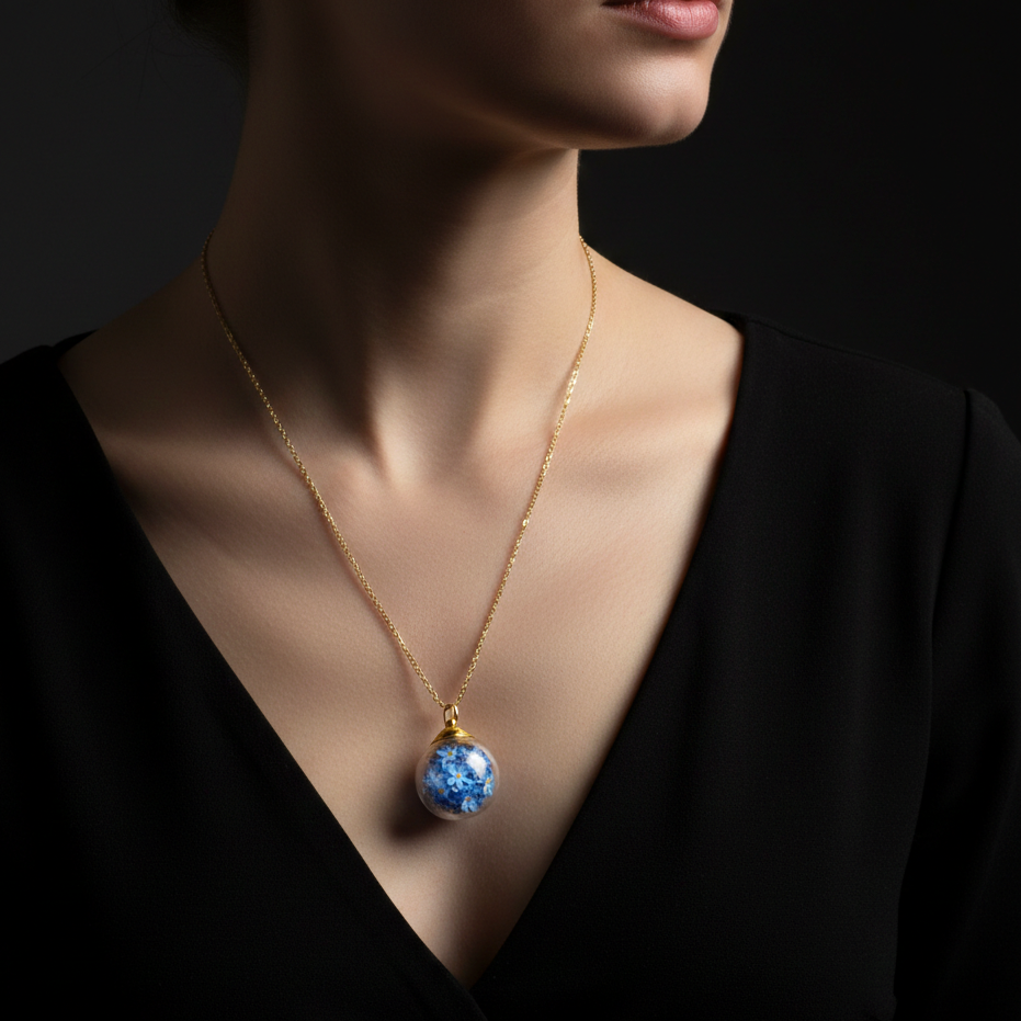Tauchen Sie ein in den Zauber Berlins mit unserer atemberaubenden Vergissmeinnicht-Halskette, handgefertigt mit größter Sorgfalt und Hingabe. Diese elegante Kette misst 50 cm in der Länge und trägt eine perfekt geformte 2 cm Kugel, gefüllt mit zarten Vergissmeinnicht-Blüten, die direkt aus unserem eigenen Garten in Berlin stammen. Die Blumen sind kunstvoll in der Kugel angeordnet, was dieses Schmuckstück zu einem wahren Blickfang macht.