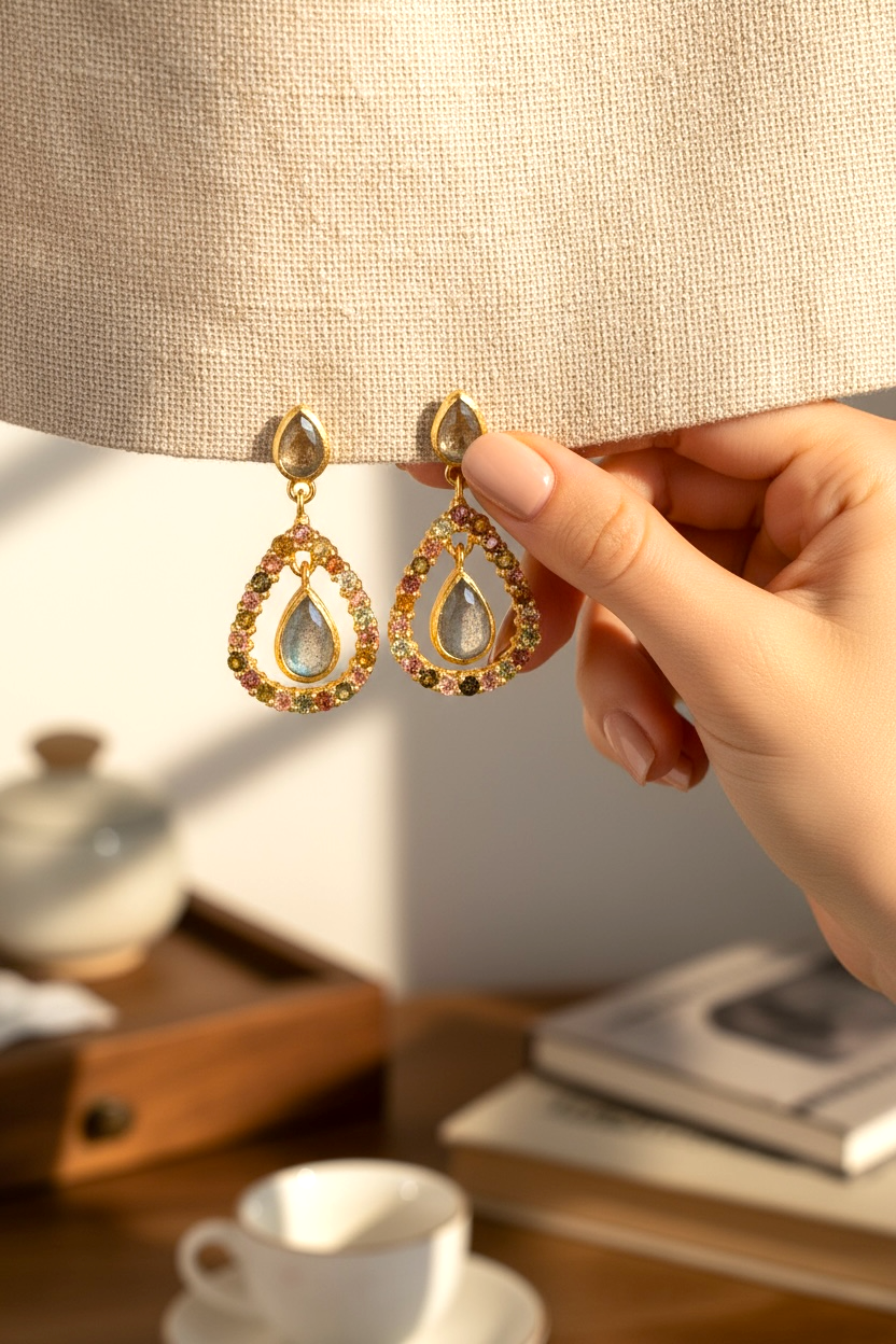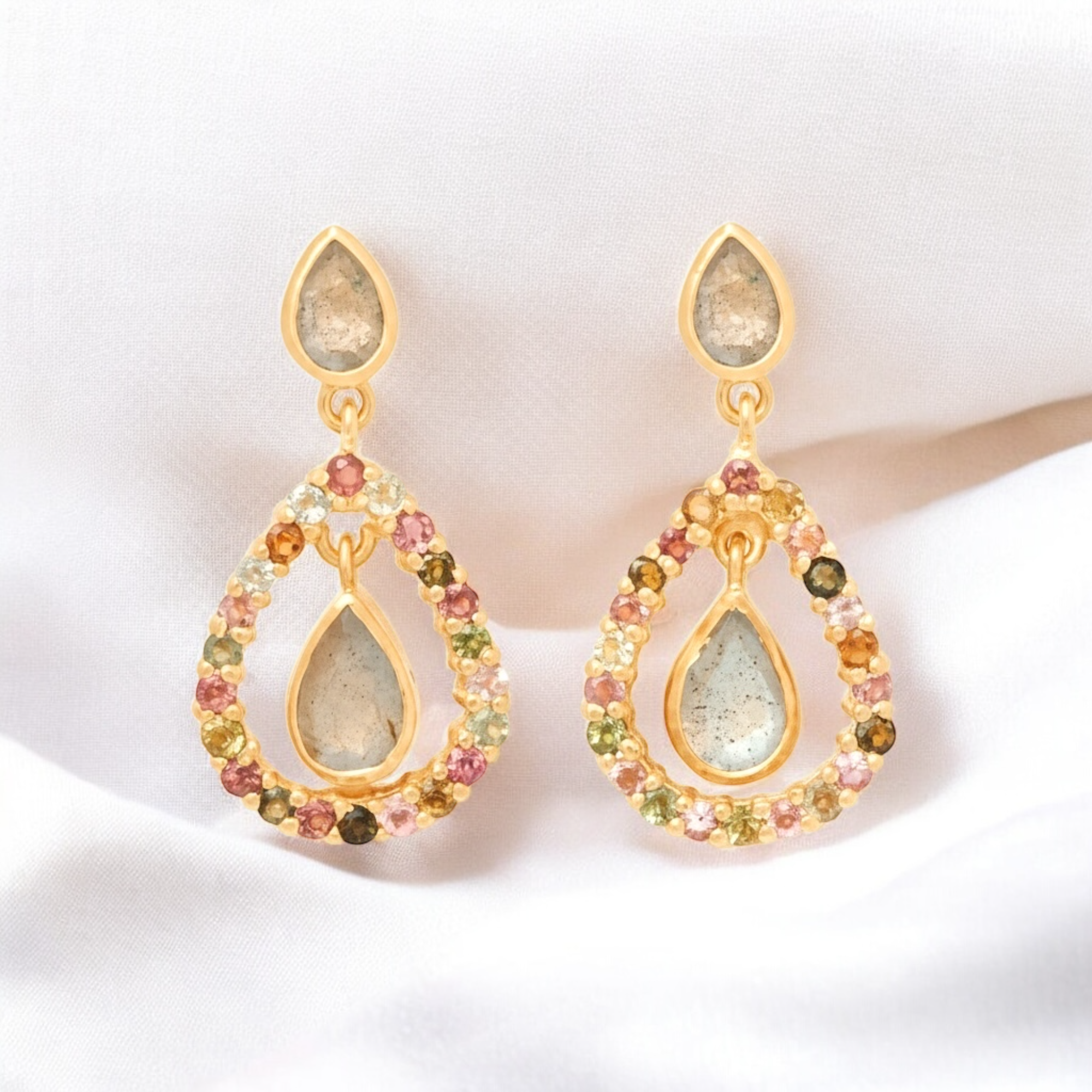 Diese eleganten Ohrringe vereinen natürliche Schönheit und edles Design. Gefertigt aus hochwertigem 925 Sterling Silber und mit 18K Gold vergoldet, präsentieren sie schimmernde Labradorit-Steine in tropfenförmiger Fassung, umrahmt von funkelnden Turmalin-Edelsteinen in sanften Regenbogenfarben. Jeder Stein ist einzigartig und sorgt für ein luxuriöses Farbspiel bei jeder Bewegung.