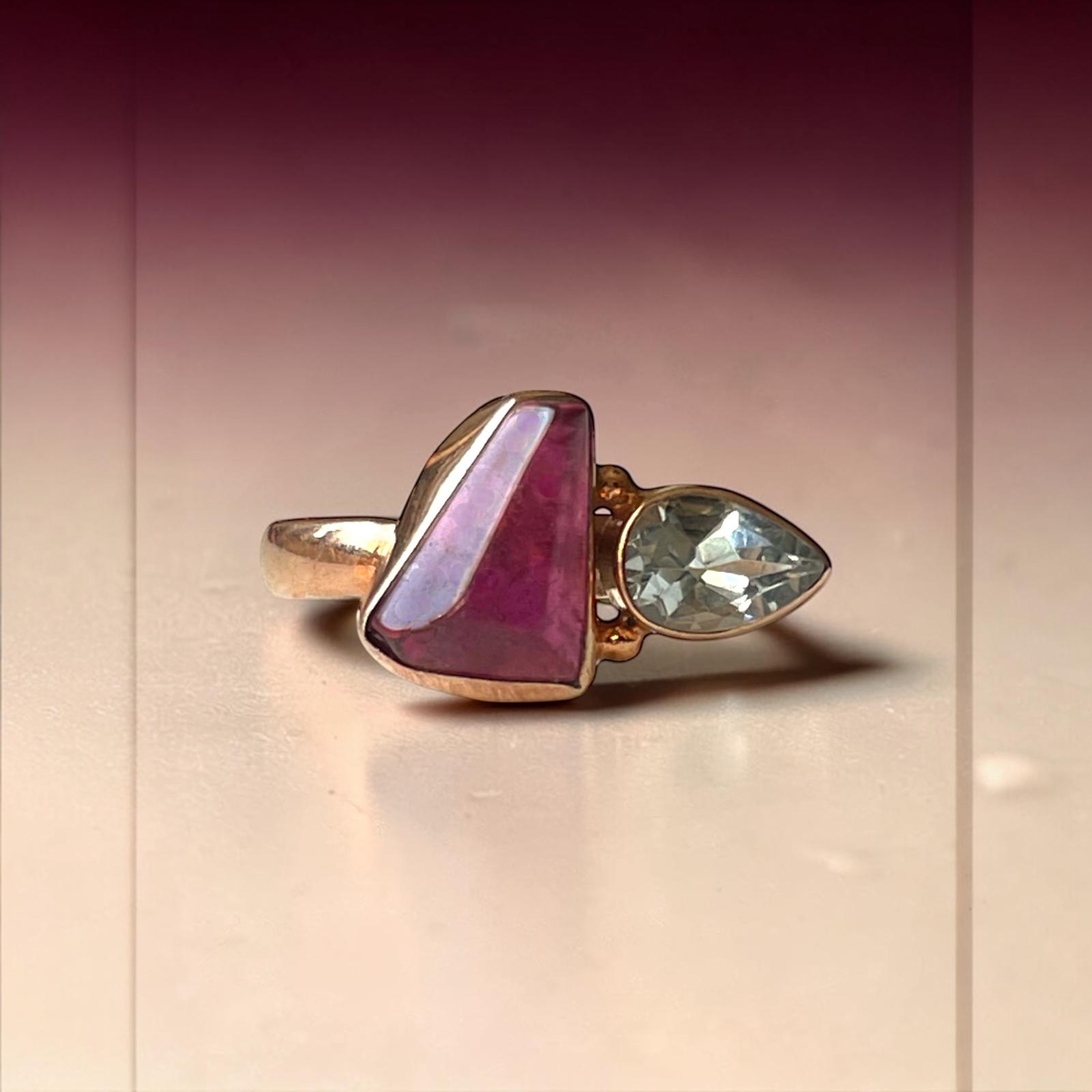 In diesem Ring treffen zwei kraftvolle Edelsteine aufeinander, die in Form und Farbe perfekt kontrastieren: