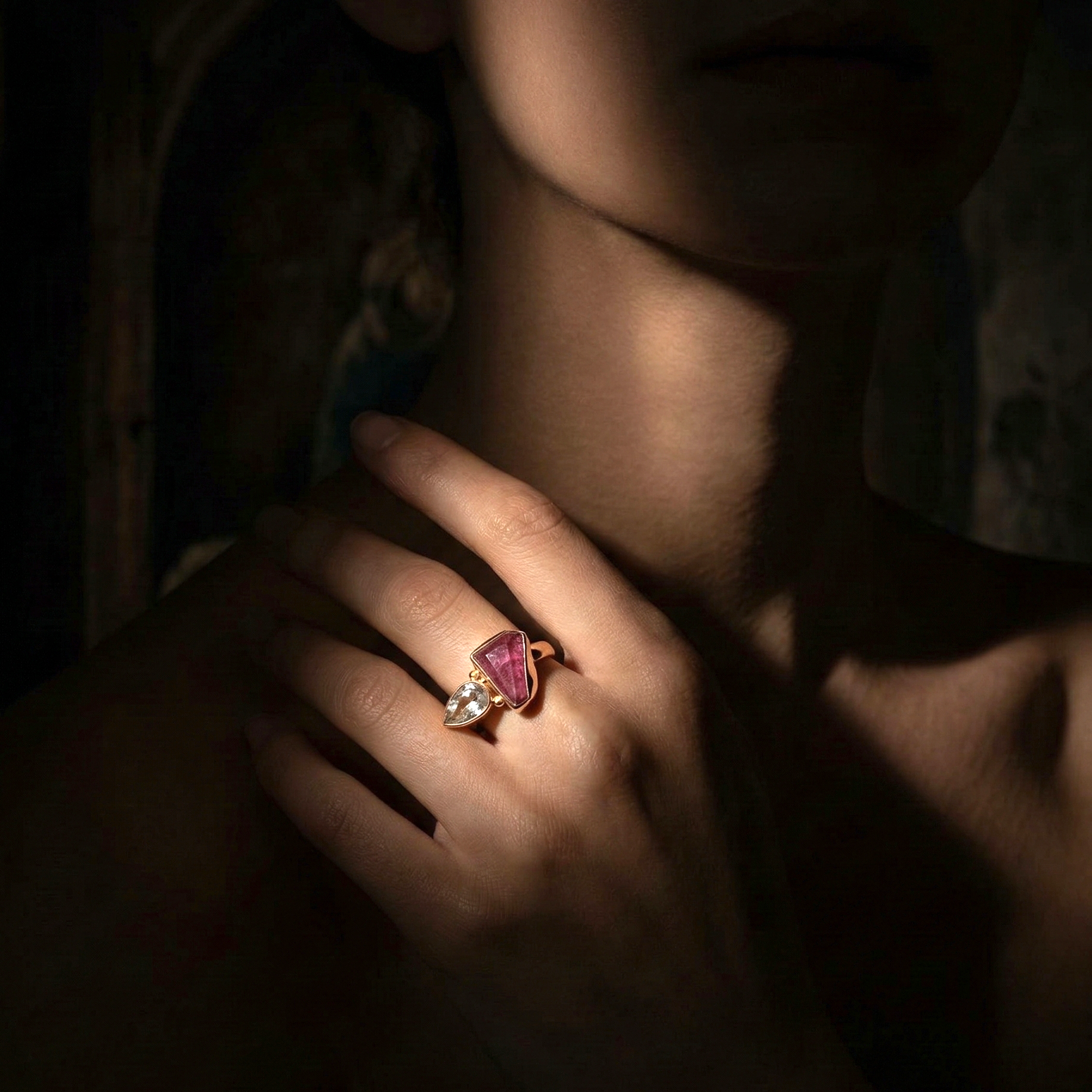 • Pinker Turmalin (Rubellit-Nuance): Der große, im freien Trapez-Schnitt geschliffene Stein beeindruckt durch seine intensive, tiefrosa bis magentafarbene Leuchtkraft. In der Edelsteinkunde steht der pinke Turmalin für die Liebe, Selbstvertrauen und emotionale Heilung. Er gilt als Stein des Herzens, der die Kreativität fördern und Lebensfreude schenken soll.