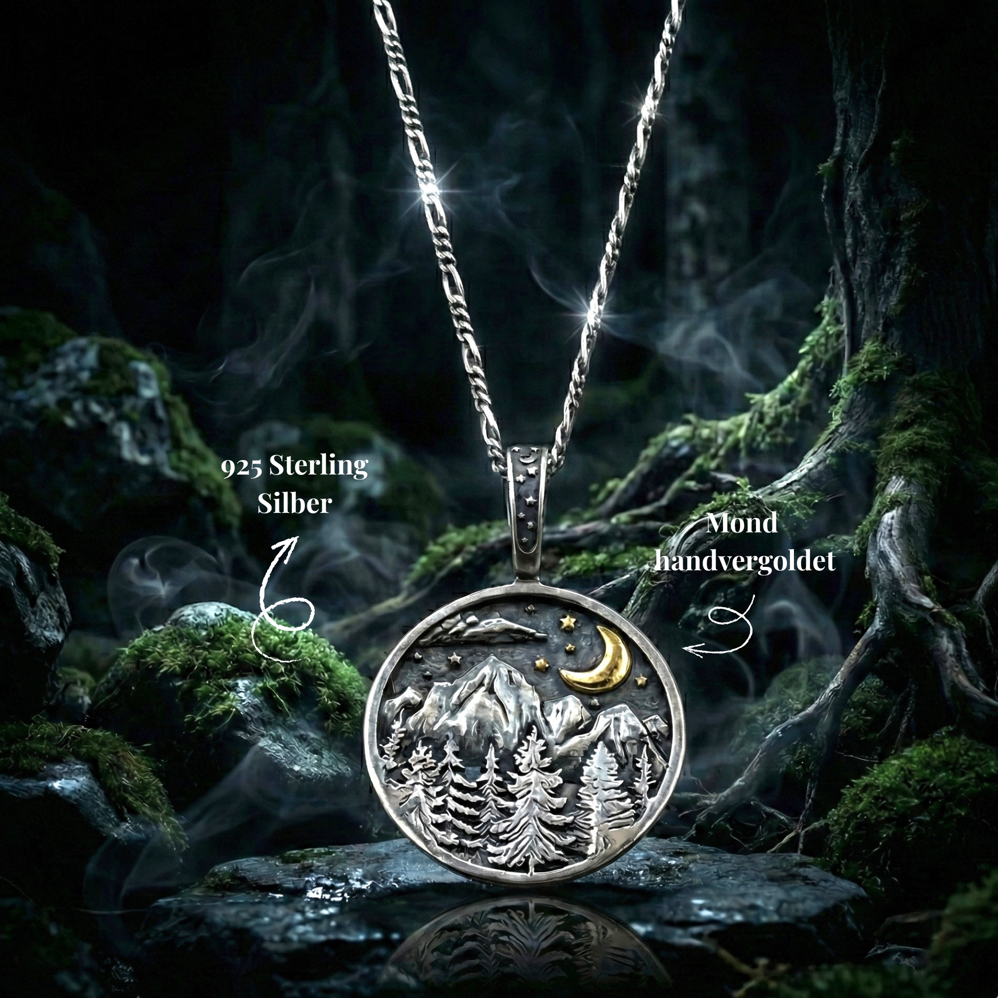 Der 925 Sterling Silber Anhänger mit einem Durchmesser von 2 cm zeigt eine detailreiche Szenerie mit erhabenen Gipfeln, sanften Tannen und einem anmutigen Nachthimmel mit Mond und Sternen, was die Verbundenheit zur Natur unterstreicht. Jedes Stück ist einzigartig und spiegelt die geheimnisvolle Schönheit der Berge wider.