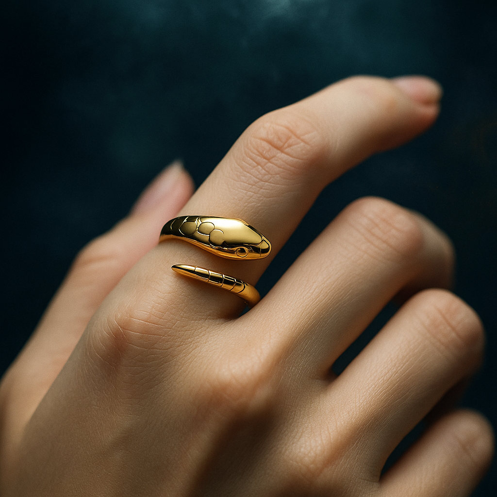 Unser eleganter Schlangenring ist das perfekte Accessoire für alle, die Luxus und Stil lieben. Hergestellt aus hochwertigem Echtsilber und vergoldet, glänzt dieser Ring mit einem edlen, goldenen Finish.