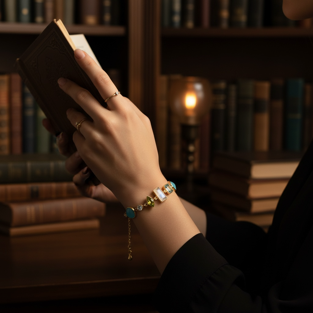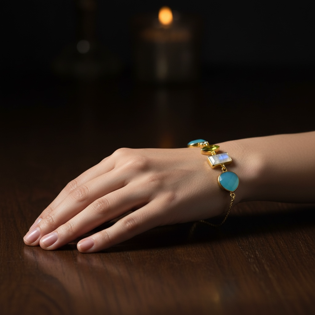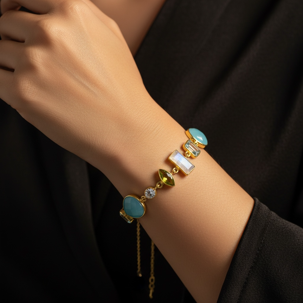 Das Highlight dieses Armbands sind jedoch die atemberaubenden Edelsteine, die kunstvoll in das Design eingearbeitet wurden. Der Chalcedon, Aquamarin, Mondstein und Peridot wurden sorgfältig ausgewählt, um eine harmonische Mischung aus Farben und Texturen zu schaffen.