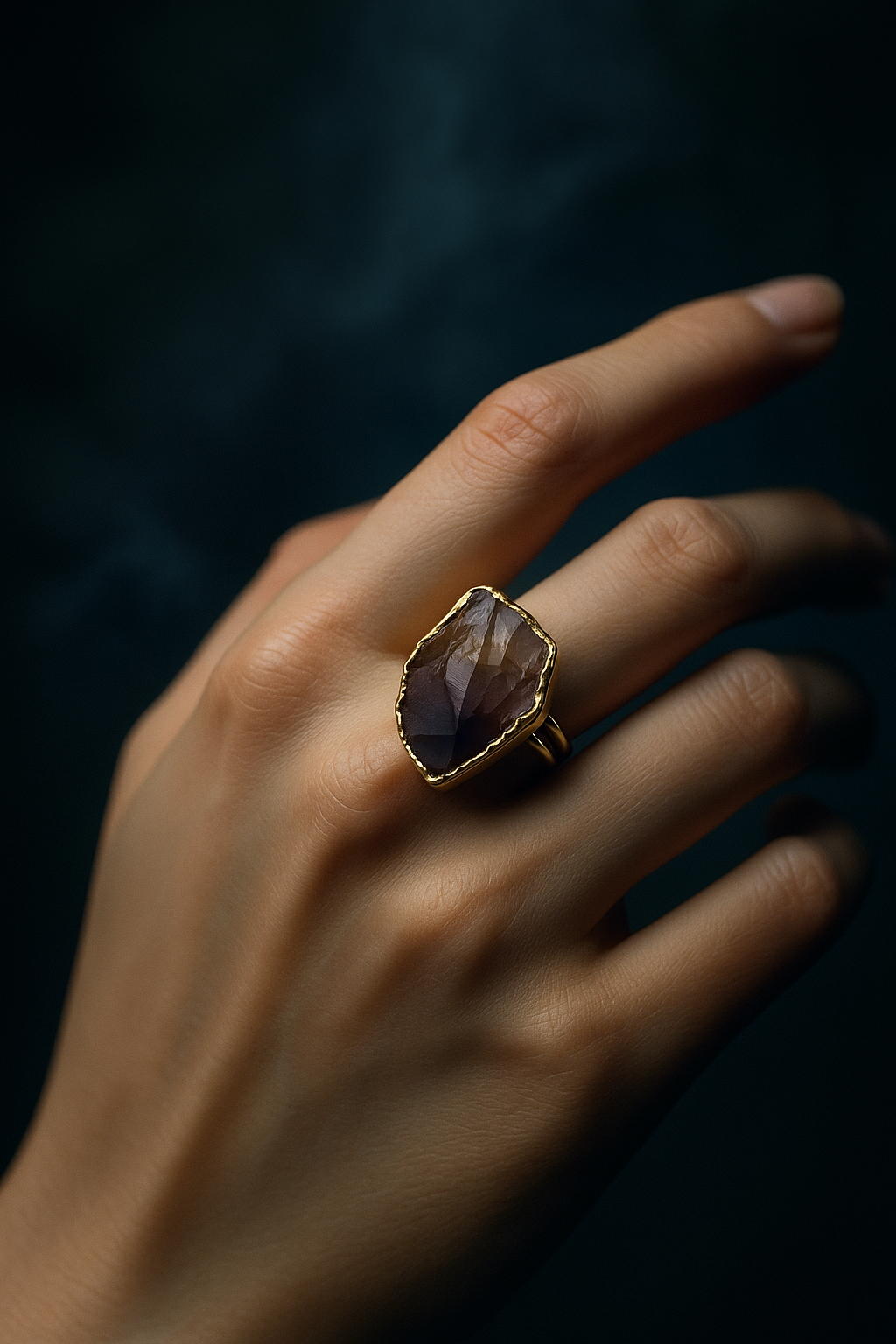 Dieser vergoldete Ring mit großem Rauchquarz in Rohform zieht alle Blicke auf sich. Der naturbelassene Edelstein besticht durch seine tiefbraune, geheimnisvolle Farbe und verleiht jedem Outfit einen Hauch von Eleganz und Stärke. Jeder Stein ist ein Unikat – in seiner Form, Struktur und Schattierung einzigartig.